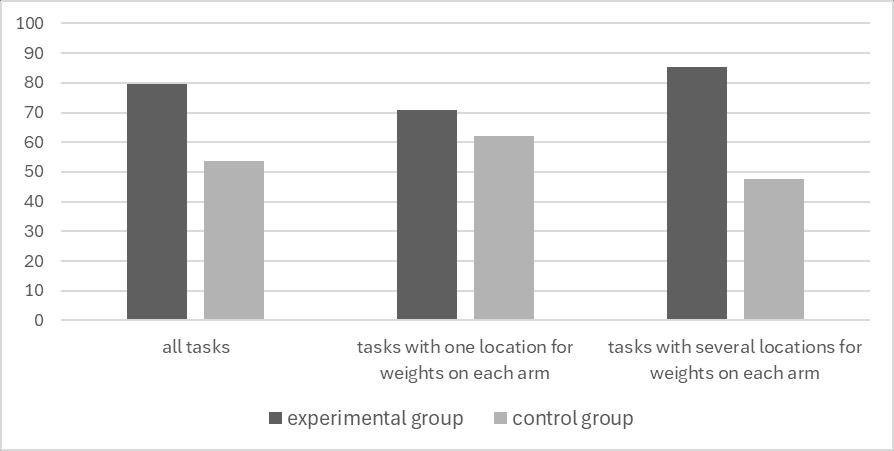 Note. The difference in the achievement rate between the experimental and control group is significant (φ = 2.681, p< .01 for all tasks and φ = 3.964, p< .01 for “scattered weights” tasks and φ = .825, p> .05 for “concentrated weights” tasks).